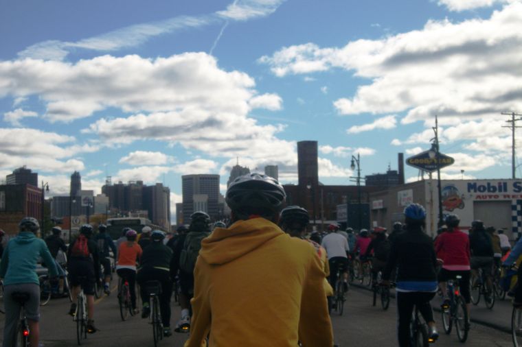The South End – Riders participating in the Tour de Troit take in the view of the downtown Detroit skyline.